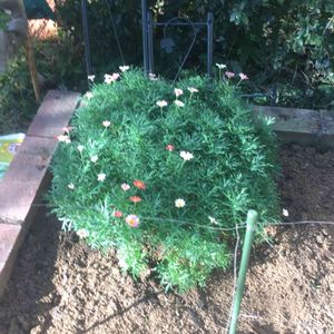 今はちょうどひとつもお花はありませんが😅秋に地植えに移したマーガレット苺ミルク🍓🥛濃いピンクから白へと色変わりする種類です。この子が満開になる日を心待ちにしております♫ 絶対に霜に当てないよう天気予報と毎日睨めっこですね😄