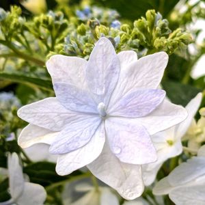 雨上がりの庭でガクアジサイの花に水滴がついて輝いていました。