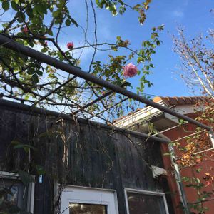 一心不乱に土いじりをしていて、ふと見上げると…ピンクのバラが咲いてました!