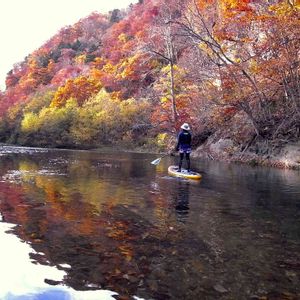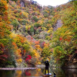 終盤を迎えている定山渓の紅葉。 SUPで岩壁と樹々に囲まれた水の上から、過ぎ行く晩秋の紅葉を楽しんできました。