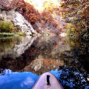水の上からの眺め。 青空と岩壁、樹々や山野草の紅葉が映り込む水面が美しかった。