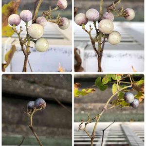 野葡萄の実の色の変化観察5 ほとんどの実が白くなりました。 左上 11月23日 右上 12月7日 右下 12月10日 左下 12月21日 12月7日の写真を撮った後、小枝がもろくなってたので、鳥よけようのネットをはずしてたら、実がなくなってしまいました😱 残った実 二個は干からびて萎んで黒ずんでます。 緑色→赤紫色→紫色→瑠璃色→水色→象牙色 観察は終了です。 🙇♀️長い間ありがとうございました🤗