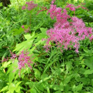 シモツケソウ、かなぁ! キョウカノコ、でしょう もみじの葉のような葉が キョウカノコと思って ます。 鮮やかなピンク色で綺麗です。 違ってたら、指摘おねがいします🙇⤵️