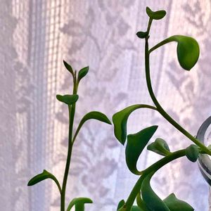 ドルフィンネックレス。 うーん🤔 徒長気味なのでしょうか? しかも、新葉がドルフィンっぽくない😢 これからドルフィンっぽくなるとか⁉️ ではないかな? 撮影は夕方で、夕陽だからやわらかですが、朝は陽当たりがいいんですけどね… いつもは、レースのカーテン越しの窓辺で陽当たり良好。 来客がある数時間だけ、明るい廊下に置いています。 どうしたらドルフィンっぽくなるのでしょうか?