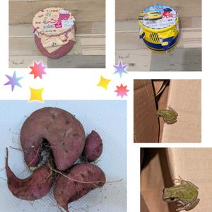 🏷️i love はちゅ ↘今年初めて庭に居たカエルちゃん🐸 可愛い💕 暑過ぎて、全然来なかったなぁ😭 ↙家で芋掘りしました🍠 サツマイモのヘタを植木鉢に植えてみた、小さいながら芋が出来ていました😃🎊🎉 ↑駅弁 ひっぱりダコ🐙 キティちゃんと、ドクターイエロー🚅