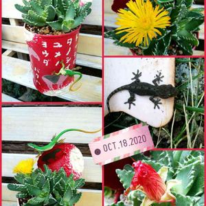 I love はちゅ🏷参加させていただきます💚 前回のプレ企画品💞 素敵なバクの夢リメ缶に この前の多肉とみどりのマルシェで見つけたガオガオくん入れました~(≧∀≦)✨ いい感じ~💚 蕾をつけていたからワクワクしてたら、すぐに開花💛 慌てて撮影会をしてこの日を待ってましたよ~💚 同じ頃にたまたま見つけたヤモリちゃん💕小さくて可愛かった(*^-^*)このくらいなら大丈夫(笑) 黄色いお花が咲いた後は赤くしぼんでました❤ ガオガオくんの本名何でしたっけ……(^◇^;)?