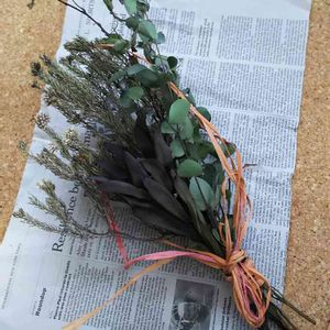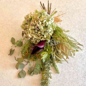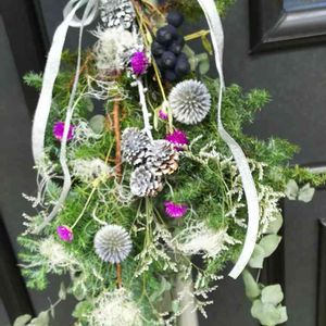 ドライのスワッグ。 デルフィニュームやユーカリの葉や実、ラグナスなどを麻布で巻いてます。