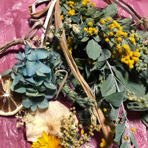 こんばんは☺️ ドライフラワーの整理も兼ねて スワッグ💐作りました〜✨ 去年のユーカリですが 葉を触ると独特の香りがして 癒されました🌿🌿