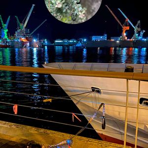 朝から夜景で失礼します😅 今日は、バトンハウスさんの🏷ワンワン祭りに参加させていただきま〜す💓 例によって、夜のお散歩🐕🦺 造船所のクレーンがライトアップされてキレい✨ おっ月様(なわけない💦)には 新芽が赤いネイティブブルーベリーのプリティ、ちらっとお目見えです❣️ ワンコ🐶もみんなよい一日を🦴