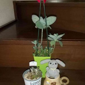 こんにちは☀ ウサ耳祭り、棒の日、ワンワンの日参加させて下さい(欲張りな私😅ごめんなさい) 子宝草とジャイアントラビット、 昨日まつぴよ🎅さんからかわいいチビウサ🐰が、届きました。 ワンワンは、長くエンピツ立てにしていたカップです。 まつぴよさん、またまたありがとうございます💕