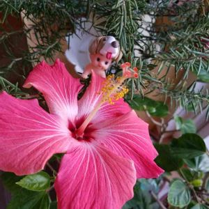 ローズマリーの枝をよじ登り、🌺に話しかける🐶QPのミル😆💟 昨日届いたほーちゃんの🐶QPと、この日のために開いたかな🌺 🐶先代ミニチュアビーグル「ミルティー」とそっくりなんですょ。 ワンワン祭に参加します🎵 U^ェ^Uワンショイ🎶
