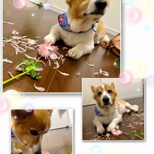 ☆わんわん祭り☆ 今月も参加させていただきます(* ॑꒳ ॑* )⋆* さぁ✨お祭りだからオシャレしよう💕とアネモネを耳に付けてみたら、、、引きちぎられました😅 みるく12歳♂コーギー🐶