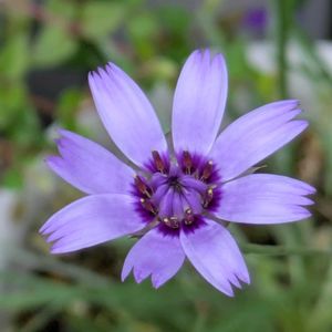 カタナンケ アモーレ ブルー(耐寒性多年草) お花のラベルの写真より花びらの数が4分の1くらいしかないのですが…美しいからまぁいいか😆本当は60㎝くらいの茎の先に咲くのですが、日当たり悪いため、お日様を求めて茎が曲がってしまっているんです😅