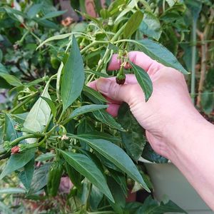 玄関前のシシトウさんです。 今から元気になりだしてます😅 分かりにくいけど😆しだれシシトウになってて、前屈シシトウにもなってます😂 ポキッとならないように気をつけてます😆