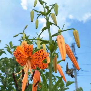 本日も暑いです。ユリ2種。オニユリいよいよ開花。いいねー。水やりしたのでちょうどアゲハ蝶も来ました。 2.5mくらいに伸びた百合はテッポウユリ でした。さっさとカットして花瓶へ。支柱は一切立ててない、むしろうちの支柱より太い。1種類しか植えてないはずだけど、他の株たちより遅く咲いたのは巨大化したからかな。