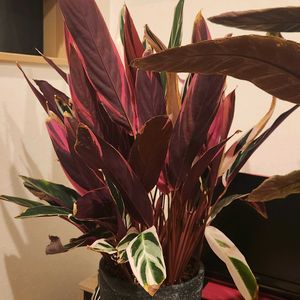 カラテアトリカラー🪴葉先がちょっと傷んでるトコあるけども380円は お買い得✨️(鉢別)またしても 連れ帰ってしまった… 🪴🪴🪴ぎゅうぎゅうなのに~🥹 🪴ストロマンテ・サンギネア・トリオスター