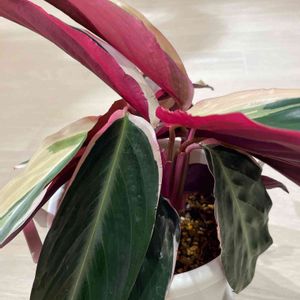 斑入りの葉の裏は、目の覚めるようなピンク✨ こんな観葉植物🪴出会ったことがなく😆 【ストロマンテ・トリオスター】 しかし、葉っぱはパサパサ… (お見せできるような状態ではなく😅) そして70%off。 よし👍 復活させてみよ! ーーということで、おうちにお招きしました。 春までは植え替えせずに。 目指せ現状維持!! がんばるぞーー👊✨ 🍏