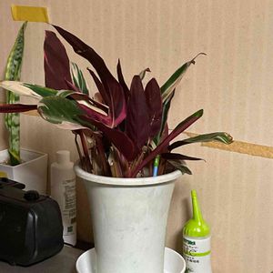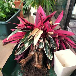 ストロマンテ・トリオスターさん、この頃葉っぱの横の方から枯れてきて調子悪いので植え替えしました👍 水が好きなんだと思うけど、やっぱり腐りやすくて鉢の外側だけか元気な根っこが覆ってて中の方はドロドロ。 だから今度は腐葉土やめて、流行りの粒状培養土にして水やりを朝晩にしてみようか🧐