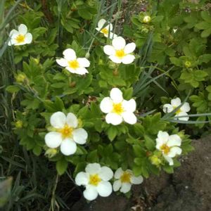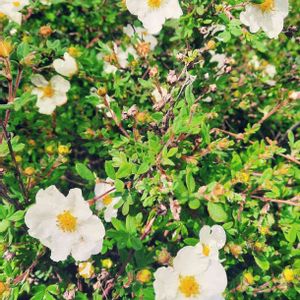 雨上がりの "ギンロバイ"(銀露梅)または "ハクロバイ"(白露梅)の "アポッツウッド"(花は清楚な純白) この特徴通り可憐な白いお花でした🤗 学名Potentilla fruticosa 'Abbotswood' (Der Fingerstrauch 'Abbotswood' ) 科名:バラ科 属名:キジムシロ属