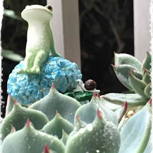 🏷️「ジメジメ梅雨を吹き飛ばせコポたん祭り」 参加してもいいですか? ↖️GS動画で紹介されてたマニキュアを使うマーブリングのリメ鉢、作りたくなって昨日の深夜に遊んでみた~ ダマダマなのもいい味出してるって事で( ´° ³°`) コポたんを添えてそれらしくʷʷ ↗️いつもと違う日当たりの良さ(期間限定)で宿根草もっりもり ホスタ レインフォレストサンライズ ヒューケラ シルバーデューク ↙️昨日もupしたタキタス、お花の大きさ分かりやすくしてみようと森村万年草の隣りに ロゼット型になる多肉の花では規格外の大きさ 2cm位あるんじゃないかな ↘️コポたんじゃないカエルくんも陽気に参加 セダム類がカラフル しっとり雨に濡れた多肉も悪くないよ~ あ でもジメジメはやっぱりイヤか