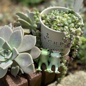 こんにちは。 昨日は凄い雨でしたね☔️ これ以上被害が大きくなりませんように🙏 🍀ネックレスの日🍀 まだまだ元気に育ってくれてる マーブルネックレスで参加させてください。ピンク色可愛いの子達も見えます💗 無事夏越ししてほしいです✨ 今日は晴れ間も見え、蒸し暑いです。 地植えの朧月さんの横で一休みのコポたんカップル🐸
