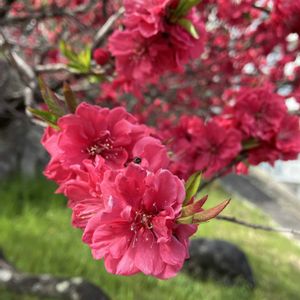 花桃 近くの住宅街の小さな緑地で咲いてます。 えっ?八重の桜?こんな色の桜ある?って調べてみましたら「桃」と出ました。 品種名はわからないけど、魅力的な容姿と色ですね〜