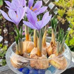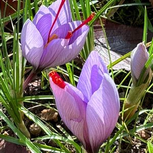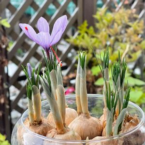 サフラン💜 「水も土も不要。部屋に置いてるだけで咲きます。」という説明書に半信半疑ながら8月に球根を購入🧄 土鍋にキッチンペーパーリードを敷いて球根を並べて観察開始👀 そのまま変化なく2ヵ月が過ぎた10月初めに芽が出てきました😲❗ 少しだけリードペーパーにお水を加えながら、ワクワクの毎日😊💓 そして、29日から一斉に咲き始めました💜💜 やったー✨😍✨ この赤いめしべを乾燥してサフランライス~パエリア作りたいなぁ😄🎵