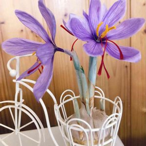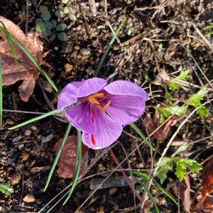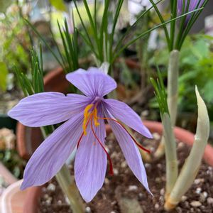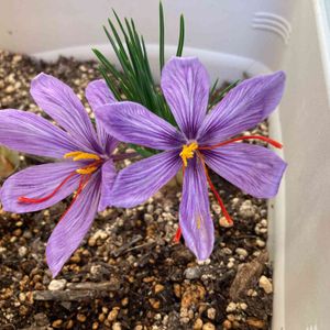 サフランの花が咲きました✨ かわいい花ですね🌸 赤いぴょろ〜んって生えてるヒモみたいなのがスパイスとして使われます♬ 世界一高価なスパイスらしいです〜