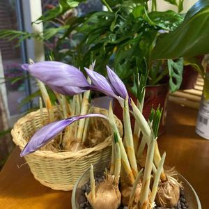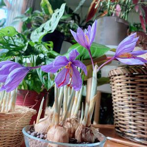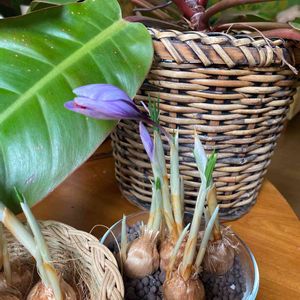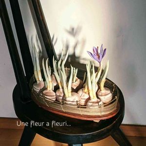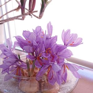 サフラン💓 今年も水無し栽培……転がしておくとも言う…… 日当たりいい窓辺だから早かった~🎵 ロールカーテンで遮光して🎵