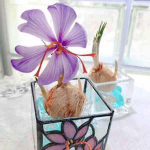 サフランのお花が咲きました🌸🌸🌸 光に透かすと花のスジスジがキレイ✨✨ サロンのお客様が素敵な鉢ポットをステンドグラスで作って下さいました😍💓 咲いてるタイミングとご来店のタイミングが合えば良いなぁ、と願うばかりです🥲🙏