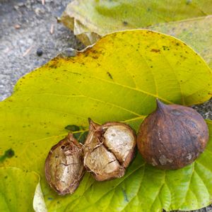 支那油桐(シナアブラギリ)/大油桐(オオアブラギリ) トウダイグサ科アブラギリ属の落葉小高木。中国原産。油桐(アブラギリ)の近縁種でよく似るが、本種は花や果実がアブラギリより大きい。種子から油を採るためにアジアで広く栽培され、日本でも関東南部以西で野生化している。葉は長さ20㎝前後で、3浅裂か不分裂。秋は黄葉する。花期は5~6月。白い花はオレンジ色の模様があり美しい。果実は径5㎝ほどで、大きく先が尖り、秋に緑から褐色に熟す。 近縁種でよく似たアブラギリは江戸時代初期に中国から渡来した。アブラギリの種子から搾った桐油(とうゆ)は、灯火、油紙、番傘、提灯などに使われた。古くから種子の油を食用や塗料用に用いた荏胡麻(えごま)に対比して、有毒で食用に適さないので毒荏(どくえ)といわれてきた。桐の仲間ではないが、葉が桐に似ていることから名前に桐がついた。 出典『秋の樹木図鑑』『里山の花木 ハンドブック』『草木の種子と果実』『日本の樹木』『樹木の名前』