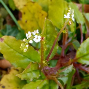 ミズタビラコ(水田平子) ムラサキ科キュウリグサ属の多年草 分布 本州、四国、九州 渓流に沿った山道に生えていました。 花は、もう、終わっている頃ですが、ほんの少し、花が見られました。 花は、くるりと巻いた花序の下部から順に咲いていき、先端部の花が開く頃には、花序は、真っすぐに伸びて、先に咲いた下部には、果実ができていました。