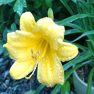 雨の中きれいに咲いています。 山野草のヒメカンゾウ(姫甘草)と思っていたのですがコメントから 姫キスゲと思います。 一日花です。 草丈 40センチ位 花径 7〜8センチ位 ユリ科 ワスレグサ属 花期 5月末〜7月 別名 デイリリー