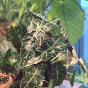 のんびりメロちゃんがやる気出してきた♡ アロカシアは葉の交代が早いから新葉出てくると下葉枯れだすのがネック🫠 見ようによっては斑入りっぽい?!