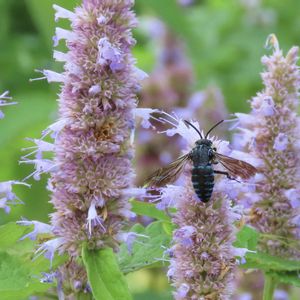 花と虫と カワミドリとブルービー 小さなブルービーは アップでよ〜く見ないと地味で小さな黒い蜂😆 なので、トリミングした観察picです♡ 触角が逞しくてびっくり‼️ そして濃い青💙と思っていた身体の色は水色🩵でした 2025.8.5