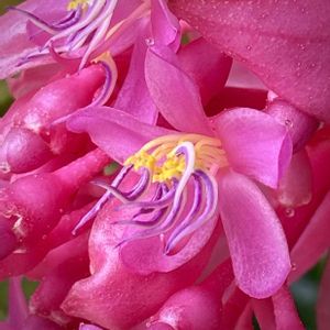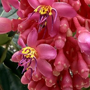 公園があんまり暑いので、温室に涼みに行くとメディニラが咲いてました〜😍💓💓💓 黄色と紫の蕊の形がノボタンに似てるな〜🤔と思って調べたら「ノボタン科」👀 なるほど〜💜💛🩷