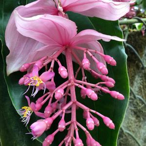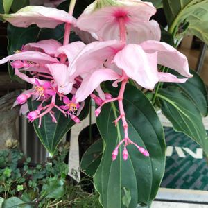 【メディニラ・マグニフィカ】 《ノボタン科》 花言葉 「移り気」「温和、親切心」 別名 オオバヤドリノボタン(大葉宿野牡丹) ピンクの花の様に見えるものは苞です。 この中に沢山の球状の小花を咲かせ垂れ下がります。 太い枝の先に大きなピンクの花房を重たげに垂れて咲かせるメディニラは、エキゾチックな雰囲気を漂わせていて、沢山の小さな花が集まり、まるでシャンデリアのようです。 メディニラという名前は1820年頃に、マリアナ諸島の知事をしていたホセ・デ・メディニーリャの名前を記念したものです。和名は「大葉の宿り野牡丹」と呼ばれます