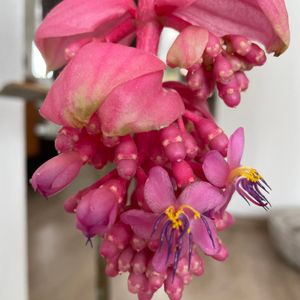 オオバヤドリノボタン (大葉宿野牡丹) メディニラ・マグニフィカ Medinilla magnifica;ノボタン科メディニラ属 前のヒスイカズラと同じくフィリピン原産🇵🇭 この薄いピンク色もいいですね 💕 花がチラホラ シベがノボタン❗️ 夏日の温室はムッとして 💦