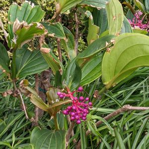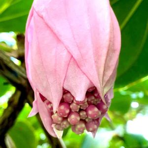 【メディニラマグニフィカ】 《ノボタン科》 花言葉 「移り気」「親切心」「温和」 「幸福が富んでくる」 別名 シャンデリア・ツリー 属名のメディニラは19世紀初頭、マリアナ諸島の知事であった ピネダのメディニーリャ(J.de Medinilla)の名に因みます。 種小名のマグニフィカは「規模の大きい」と言う意味です。 これはメディニラの中でも本種が大型の部類に入るために付いたとされます。 花はピンク色の大きな苞に包まれており、その中からブドウの房のように 細かく枝分かれした花房が出てピンク色の小花を咲かせます。 🏷金曜日の蕾たちに参加します。