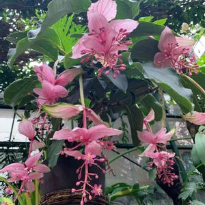 こんばんは 暑い日でした☀️ ✨熱帯の宝石 メディニラマグニフィカ✨ 別名 オオバヤドリノボタン 大葉宿野牡丹 ノボタン科 メディニラ属 フィリピン原産 熱帯性花木 珍しくてユニーク 大きくて綺麗なお花 💮💕✨ なばなの里 ベゴニア館