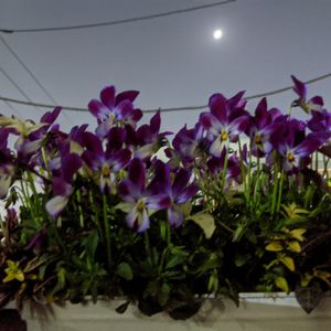 こんばんは😊🌛お月さまとうさぎビオラ。夜景モードでスマホ撮影。お月さま写すの難しい〜😖