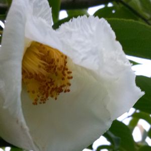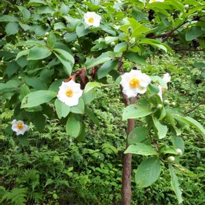 夏椿。 何本か木があるので、これは夏椿のようです。 実が出来るのは、夏椿のお隣にある木(たぶん、それは花梨だと…)でした。 密集している木の中に紛れて違う種類の木が生えていましたが、こちらは夏椿でした。
