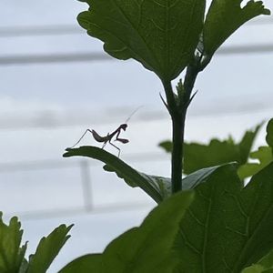 ムクゲの葉っぱの上に子カマキリちゃん✨ 凛々しいシルエットです😊