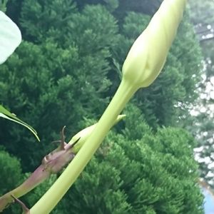 夕顔の蕾🌱日課の観察 首ながッ❗ 昨日より遥かに長く伸びてる😓 渦々も根本のあたり、ちょっと綻びかけてる、かなぁ……