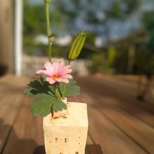 今日の庭から 庭の花を生ける✊ ミヤマオダマキの花後とローダンセマム 花器は、先日益子の陶器市で求めた お家の形の一輪挿しです。 娘にあげようと思って買ったんですけどね🤭