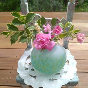 今日の庭から 庭の花を生ける✊ *斑入り大紅ウツギの葉 20年まえに挿し芽から育てましたが、今では、見上げるほどに *名前のわからない挿し芽からのバラ *スズラン ピンクが1輪だけ咲いてくれました。 2)ピンクに見えますよね🤭 花器は、リサイクルショップで求めたガラス製 淡い花器に優しい花を生ける を意識したのですが、ちょっと濃かったですね😅 ピエールさんがまだ咲いてないもので…