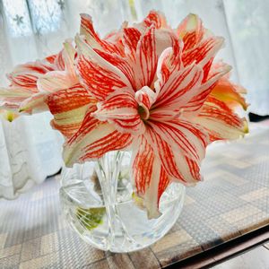 🩷三つ子のアマリリスさん🩷鉢で咲いた大輪八重咲アマリリス、一つの茎になんと三つも‼️喜んだのも束の間、重すぎてポキッと折れてしまいました💦💦ごめんね🙏花瓶で咲いてくれてます。🩷ありがとう。。