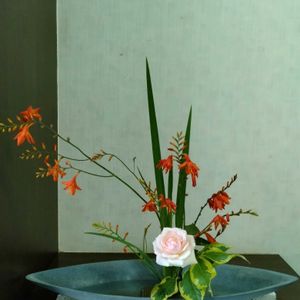 今日の庭から 庭の花を生ける✊ クロコスミアがたくさん咲いているので、生けました。 薔薇ピエールさんは二番花なので小ぶりです😊 斑入りウツギの葉を入れました。