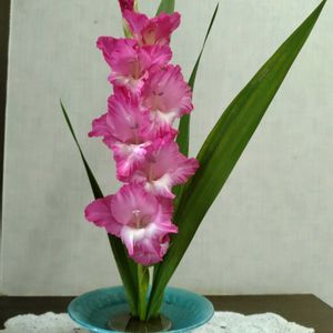 今日の庭から 庭の花を生ける✊ グラジオラス1号咲きました🩷 ピンクのグラジオラス1種生け 花器は益子の陶器市で見つけた器 ふせると富士山みたいで面白いと思いましたが、花器ではないと思われます🤭