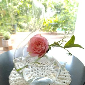 今日の庭から 庭の花を生ける✊ 硝子のスワンと薔薇 宿根スイートピーの葉を添えました。 薔薇は切り花を挿し木で育てたもので、名前はわかりませんが、もう10年くらい 経ちます。 入学式にボランティアで生けた切り花で、その新入生たちが高校生になったと聞き、びっくりです🤭